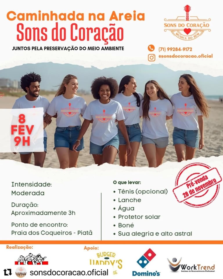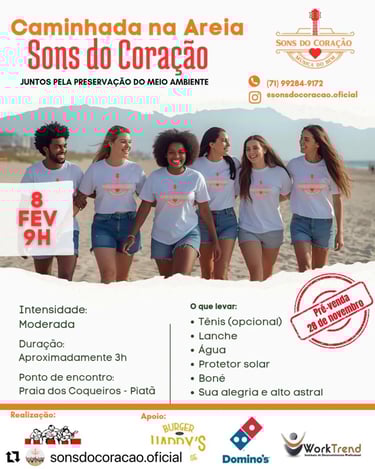 No dia 8 de fevereiro às 9hs. estaremos realizando uma Caminhada na Areia num evento maravilhoso visando a preservação do meio ambiente, onde junto iremos promover uma grande limpeza nas areias da Praia dos Coqueiros em Piatã.