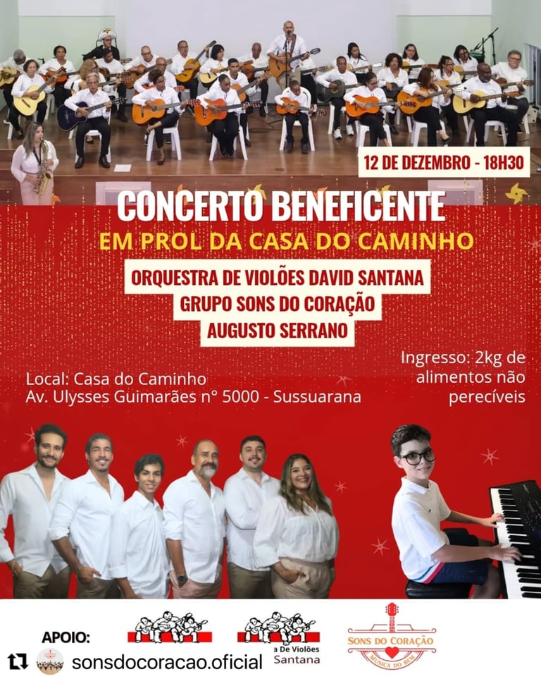 A Escola de Música David Santana, Orquestra de Violões e a Sons do Coração promovem no dia 12/12/2025 às 18h30min um Grande Concerto Beneficente em prol da Casa do Caminho - Pronto Atendimento Espírita, ingresso 2kg de alimentos não perecíveis. Contamos com sua presença.